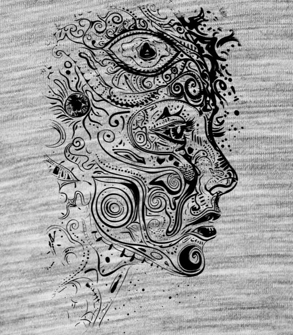 Abstraktní hlava, černý tisk. Barevný útok na scénu! Tričko pro umělce, rebely a každého, kdo má rád hluboký psychedelický styl.
