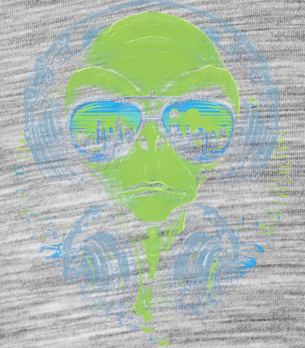 ALiEN DJ, V1. První verze tvého oblíbeného vesmírného dýdžeje. Detailní čelní portrét zeleného emzáka, který to sype do dvou sluchátek naráz. V jeho aviatorkách se odráží futuristický město a v pozadí pulzuje vesmírná aura. Čistý, symetrický a sakra ostrý design pro všechny, co žijou hudbou a sci-fi.