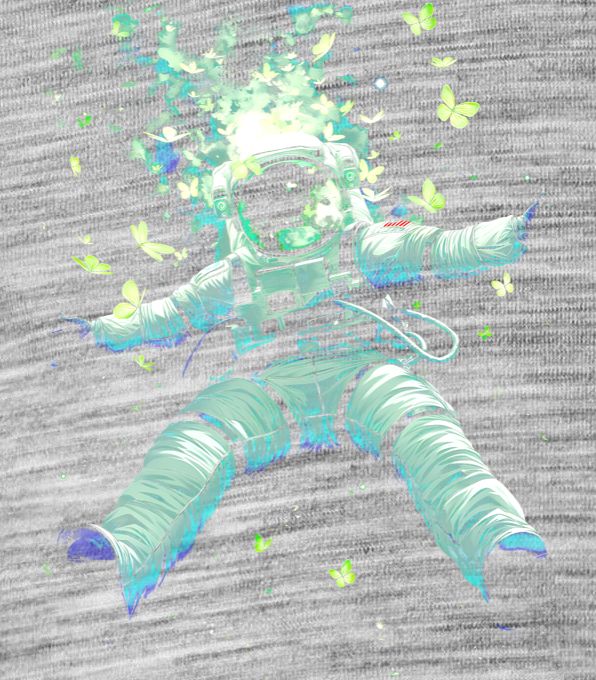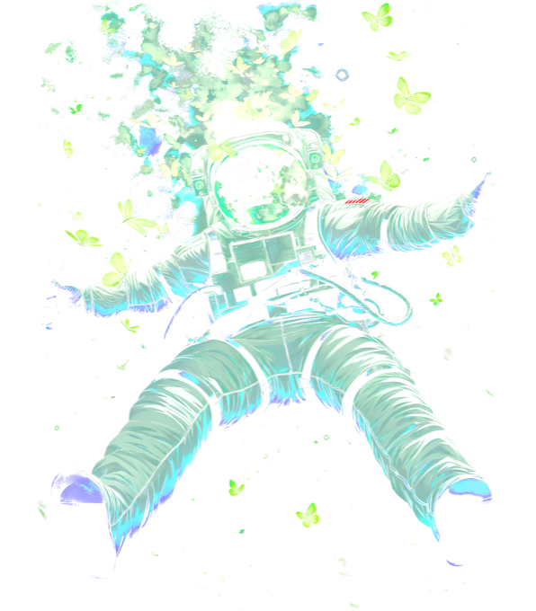 Astronaut obklopený motýly. I v chladném kosmu může kvést život. Futurismus s dotykem přírody.