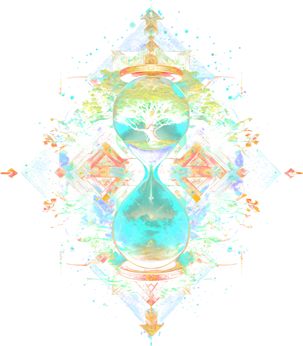 Čas přírody. Čas je relativní, ale příroda je věčná. Tento design zobrazuje magické přesýpací hodiny, v jejichž horní části roste košatý strom a v dolní se rozkládá čistá horská krajina. Celý motiv je zasazen do geometrického mandalového rámu, který podtrhuje jeho duchovní význam. Detailní, barevně bohatý potisk pro milovníky hlubokých myšlenek a precizního umění.
