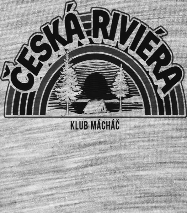 Česká riviéra, V1, černý tisk. Ultimátní nostalgie pro všechny, kteří nedají dopustit na české léto. Nádherný retro motiv ve stylu sedmdesátých let se západem slunce, siluetou stanu a jehličnanů u vody, korunovaný legendárním nápisem Česká riviéra – Klub Mácháč. Dokonalé tričko na vodu, pod stan, na letní festivaly nebo zkrátka pro každého, kdo ví, že to pravé prázdninové dobrodružství čeká na břehu Máchova jezera. Tričko, tílko, mikina, kšiltovka, zástěra, hrnek, plechový hrnek, termoska, půllitr, kraťasy, polštář.