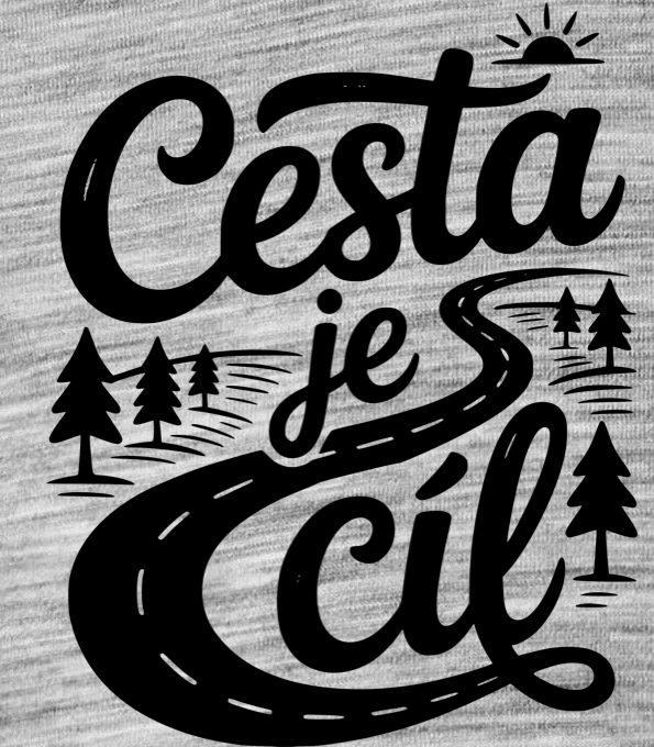 Cesta je cíl, černý tisk. Pro ty, pro které není důležitý jen konec, ale hlavně zážitky po cestě!. Perfektní pro dobrodruhy, kteří si užívají přítomnost a milují outdoor.. Tričko, tílko, mikina, kšiltovka, zástěra, hrnek, plechový hrnek, termoska, půllitr, kraťasy, polštář.