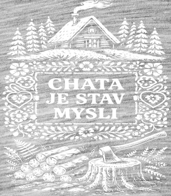 Chata je stav mysli, bílý potisk. Pro všechny, kteří nechávají starosti v údolí a na chatu si jezdí hlavně vyčistit hlavu. Tento stylový motiv v lidovém designu oslavuje klid hor, vůni dřeva a chatařskou pohodu, která je víc než jen místem – je to životní styl. Tričko, tílko, mikina, kšiltovka, zástěra.