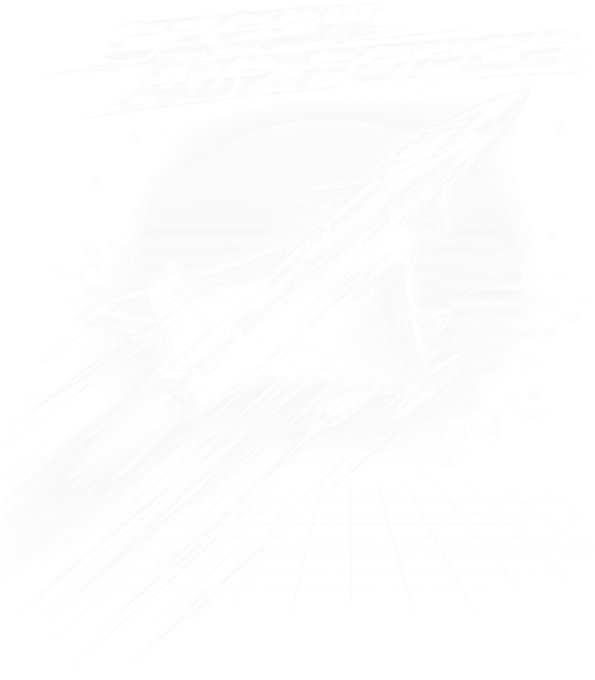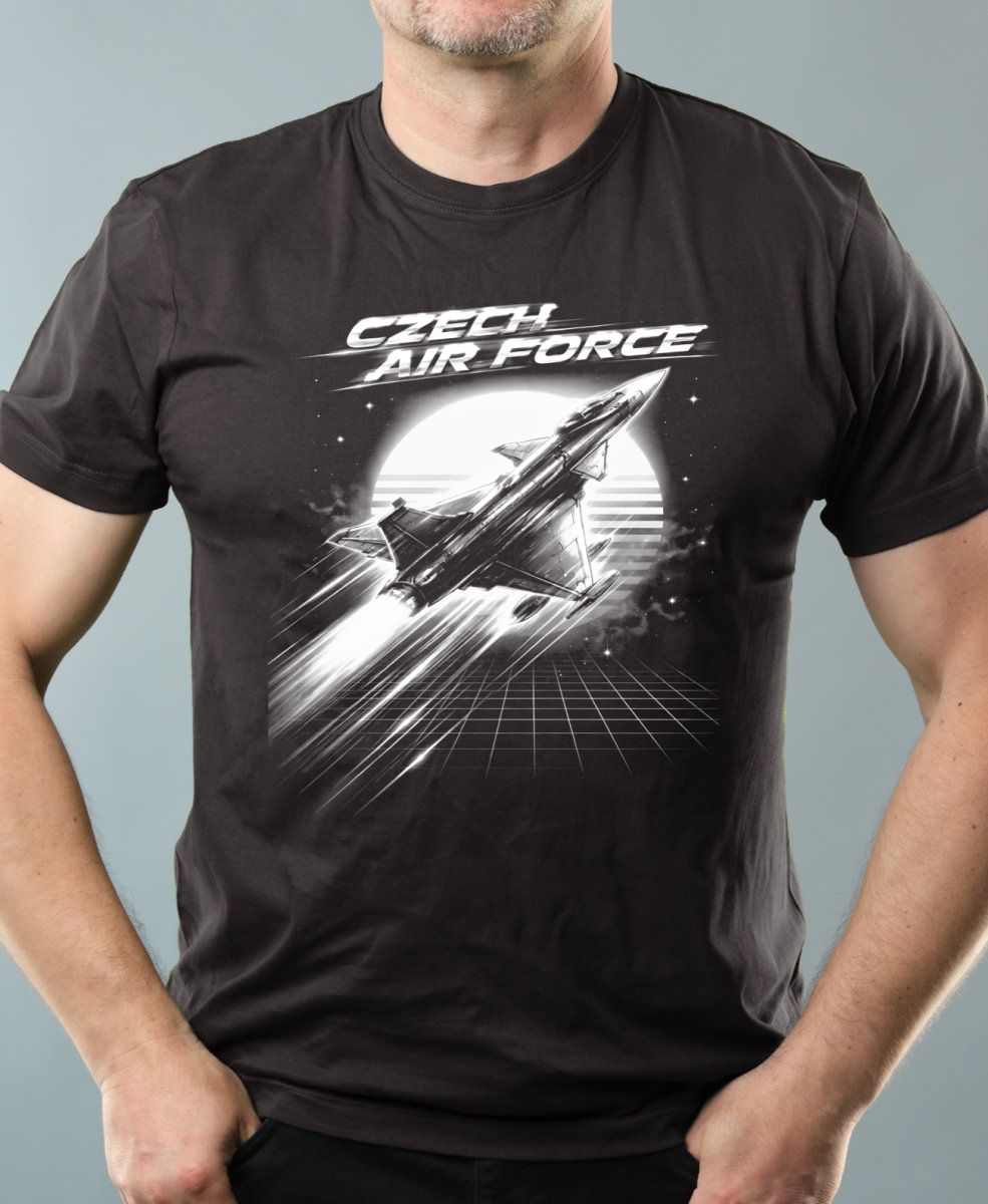 Czech Air Force, bílý tisk. Dynamický motiv s vojenskou stíhačkou v ikonickém retro stylu 80. let. Ideální volba pro piloty. nebo fanoušky českého letectva.