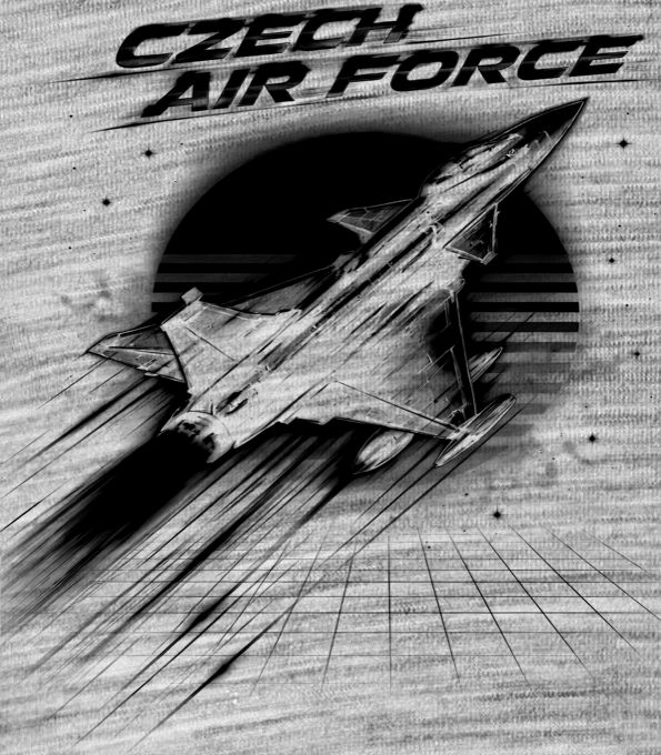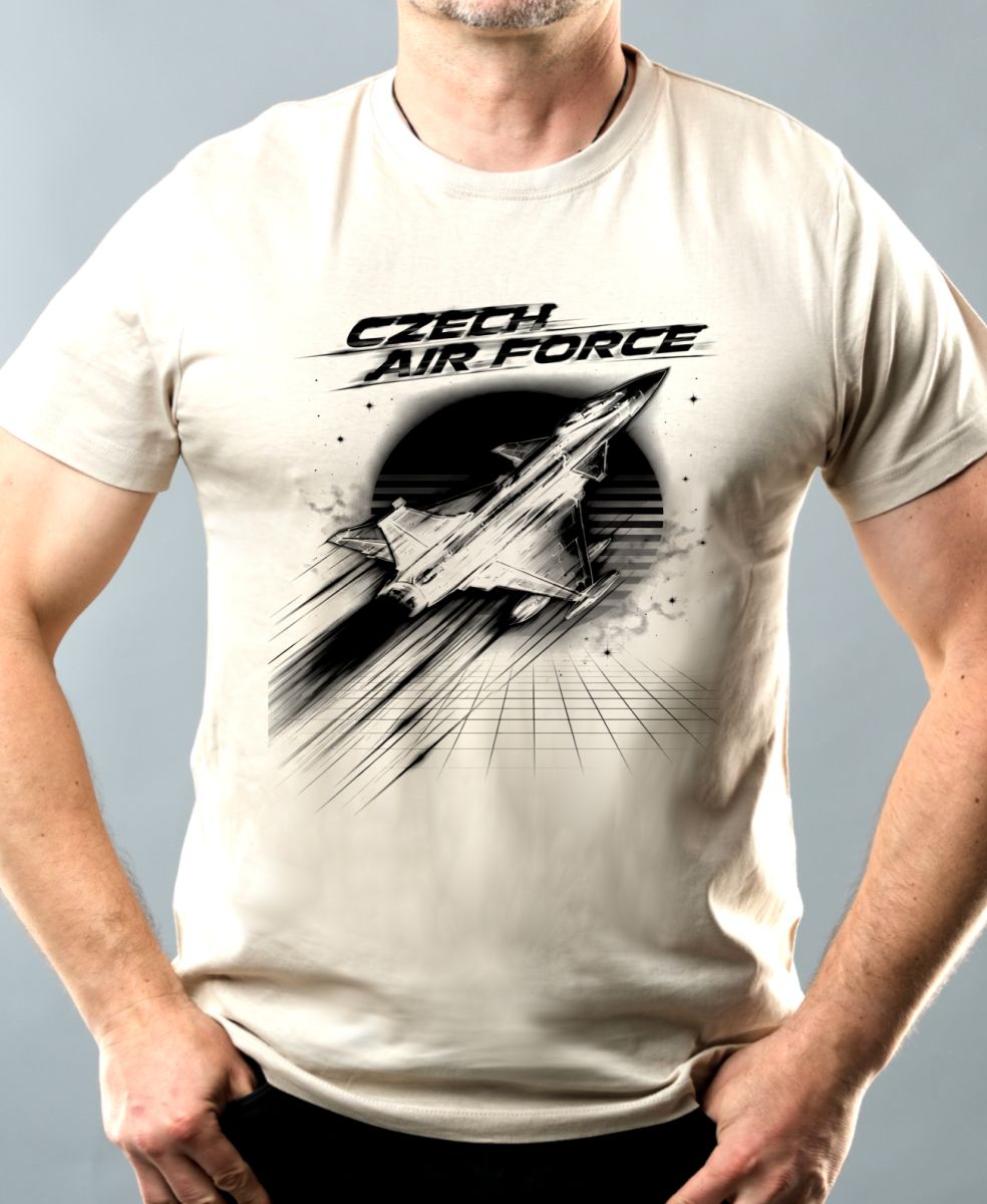Czech Air Force, černý tisk. Dynamický motiv s vojenskou stíhačkou v ikonickém retro stylu 80. let. Ideální volba pro piloty a nebo fanoušky českého letectva.