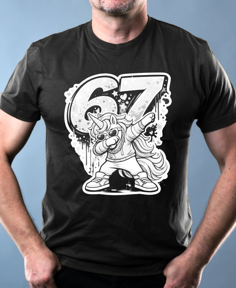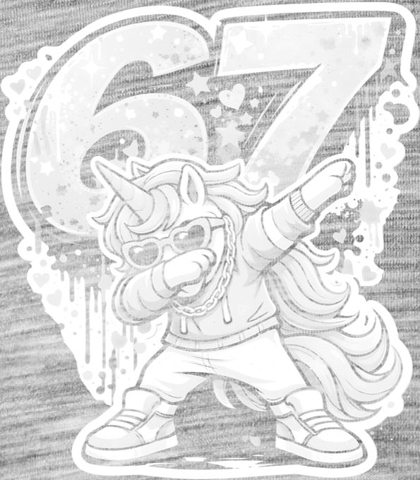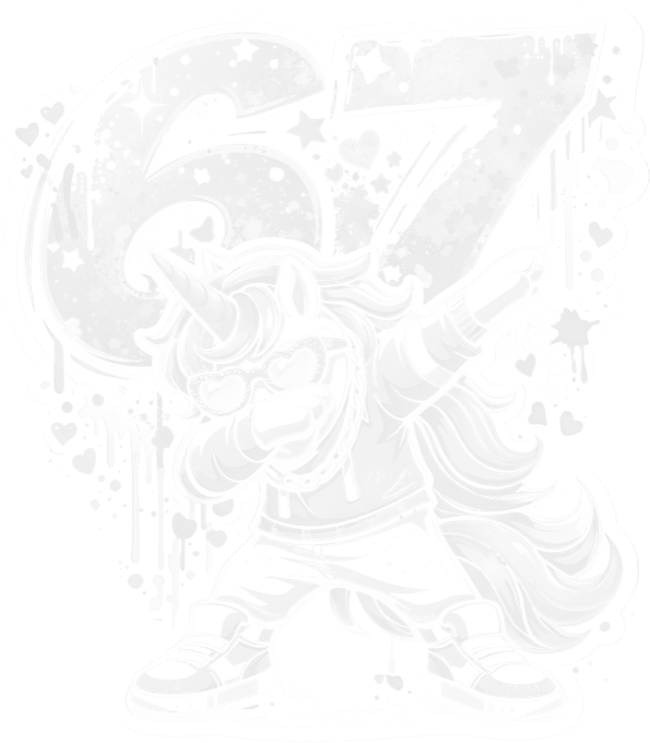 Dabující jednorožec 67, V2, bílý potisk. Tento roztomilý jednorožec předvádí perfektní dab taneční pózu mezi čísly 6 a 7. Veselý a barevný design s duhou a mráčky, který potěší každého milovníka kawaii stylu a hravých motivů. Tričko, tílko, mikina, kšiltovka, zástěra.