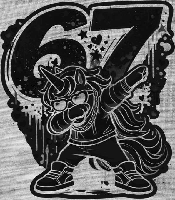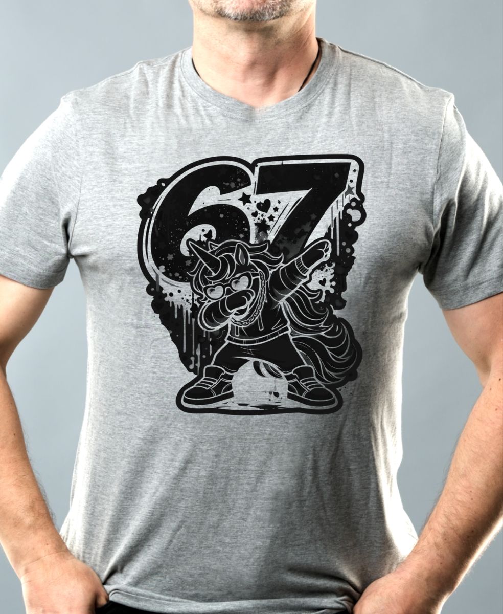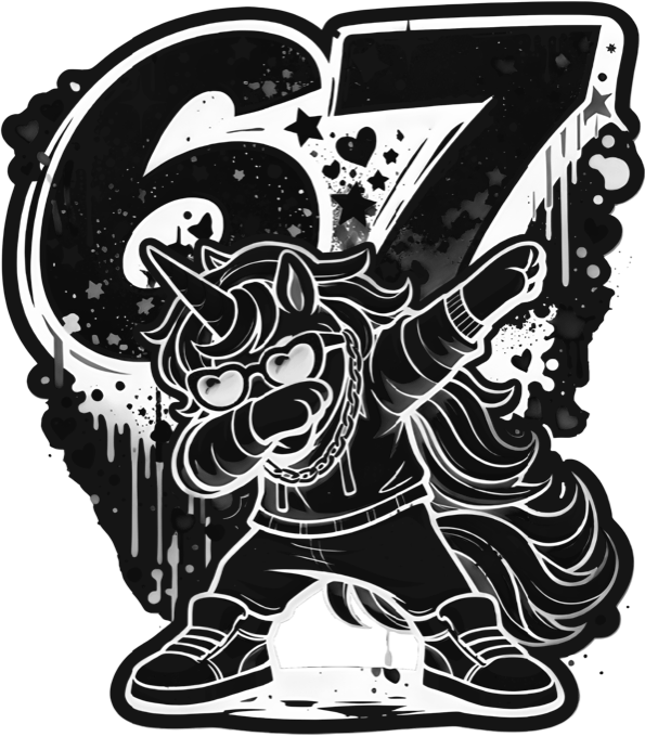 Dabující jednorožec 67, V2, černý potisk. Tento roztomilý jednorožec předvádí perfektní dab taneční pózu mezi čísly 6 a 7. Veselý a barevný design s duhou a mráčky, který potěší každého milovníka kawaii stylu a hravých motivů