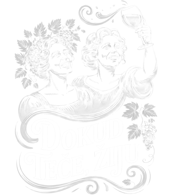 Dokud teče, žiju – víno, bílý tisk. Elegance se snoubí s životním mottem! Dámská varianta s vinnou révou a usměvavými milovnicemi vína připomíná, že každý doušek radosti stojí za to. Dokonalý společník pro večery s přáteli.