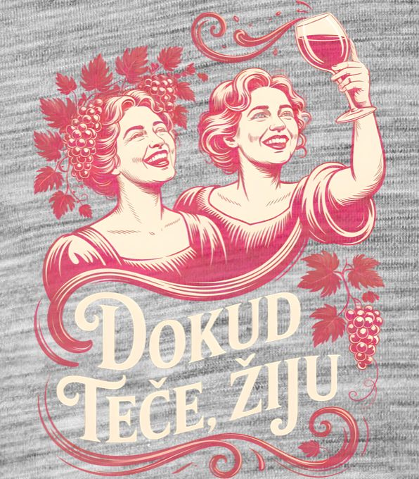 Dokud teče, žiju – víno. Elegance se snoubí s životním mottem! Dámská varianta s vinnou révou a usměvavými milovnicemi vína připomíná, že každý doušek radosti stojí za to. Dokonalý společník pro večery s přáteli.