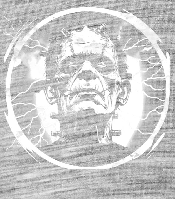 Frankenstein Reloaded, bílý tisk. Elektrické výboje, ocelové svorky a trocha toho šílenství. Ukaž, že i sešívaná duše může být stylová.