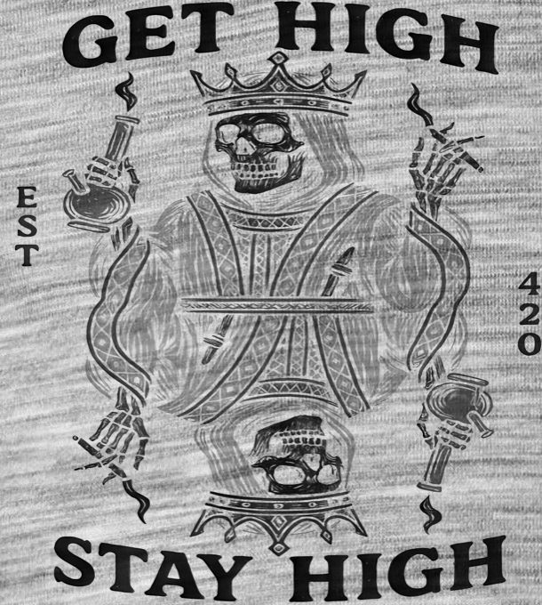 Get high, stay high, černý tisk. Temně laděný design s motivem kostlivce a krále v undergroundovém stylu. Výrazný vizuál pro ty, kteří hledají originální a lehce provokativní grafiku s nádechem streetwearu.
