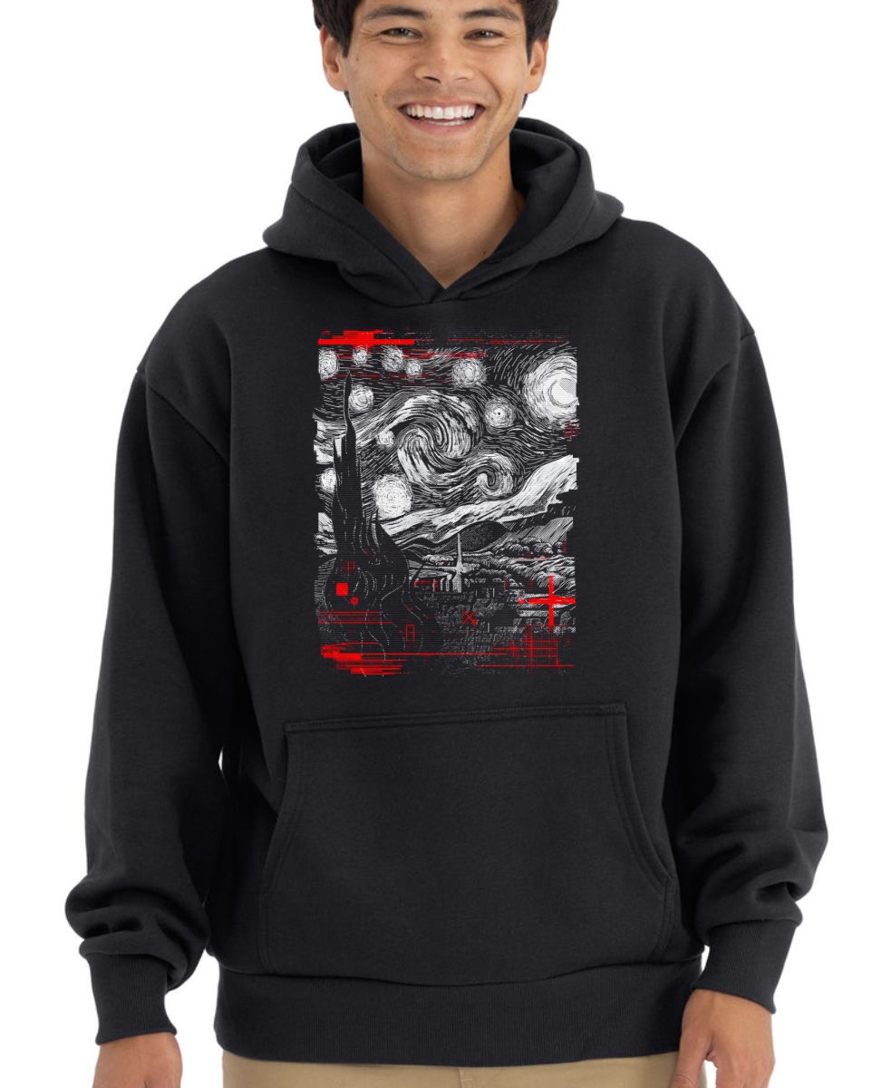 Glitch Art: Hvězdná noc. Van Goghova “Hvězdná noc” se setkává s digitální destrukcí. Klasické mistrovské dílo je narušeno glitch efekty a červenými liniemi, což vytváří moderní a temný pohled na známou krásu. Pro ty, kdo milují umění s nádechem kyberpunku.