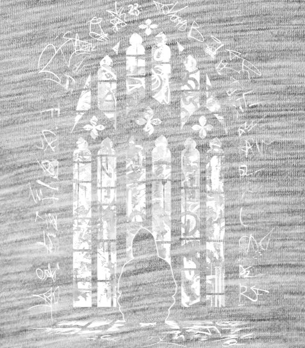 Gotické okno do pekla, bílý tisk. Když se temná gotika potká s psychedelickými barvami.
