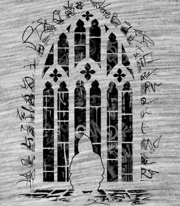 Gotické okno do pekla, černý tisk. Když se temná gotika potká s psychedelickými barvami.