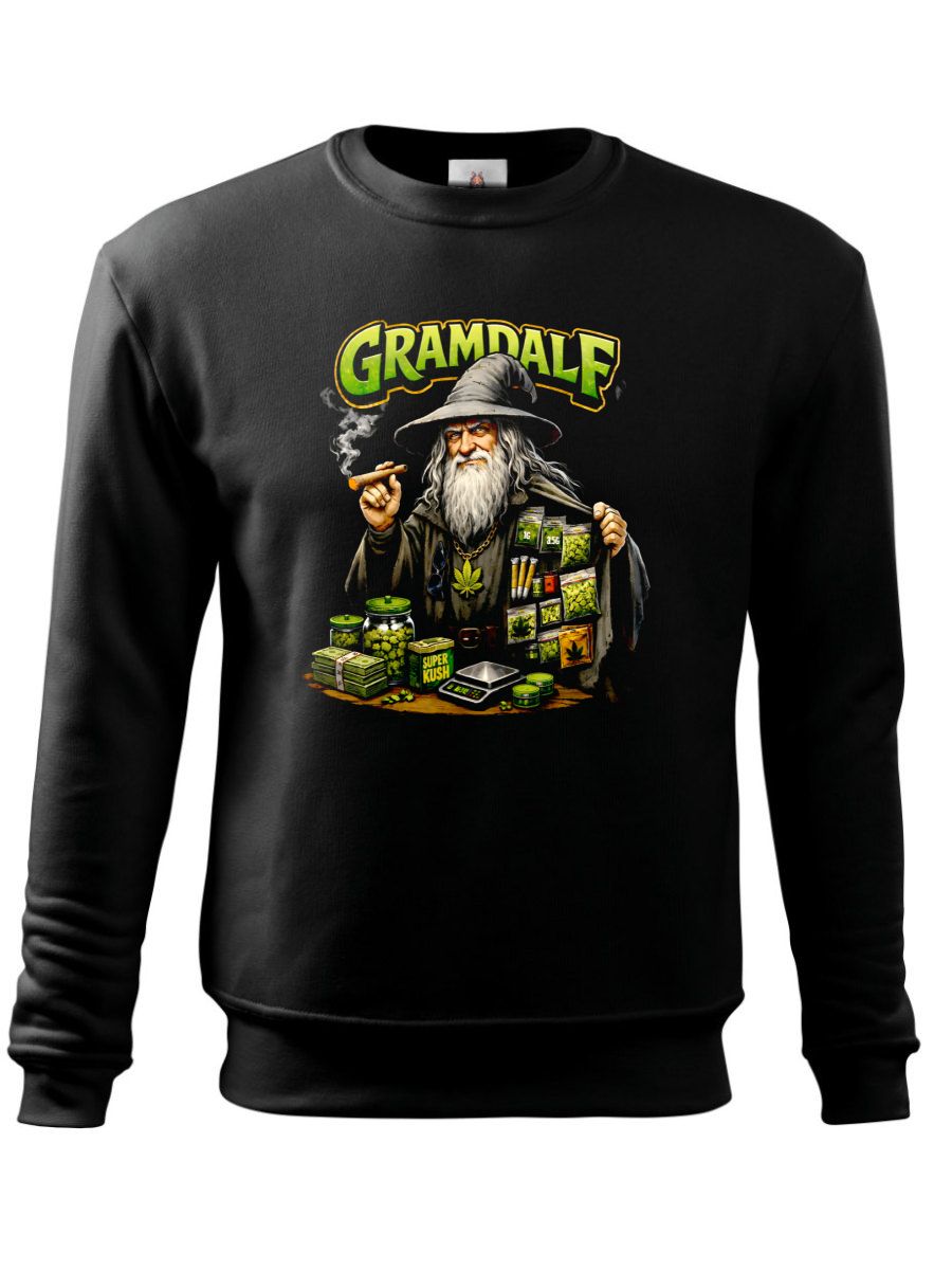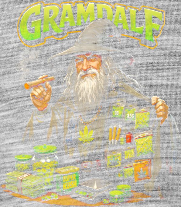 Gramdalf. Legendární čaroděj v roli nekonvenčního obchodníka s bylinkami a nápisem „GRAMDALF“ v parodickém fantasy stylu. Originální a humorný kousek pro fanoušky popkultury a specifického humoru.
