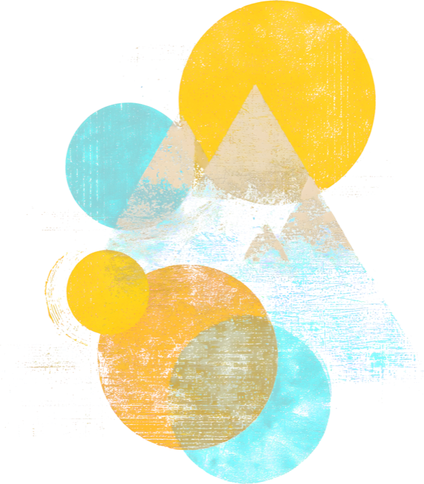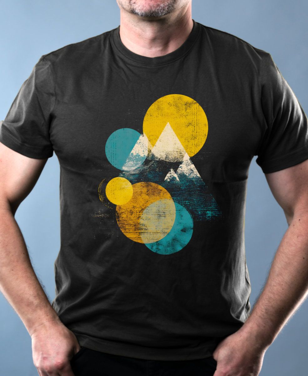 Horská geometrie, V1. Stylové spojení přírody a abstraktního designu. Motiv zobrazuje zasněžené horské štíty v kombinaci s výraznými žlutými a azurovými kruhy v retro „grunge“ stylu. Vertikální kompozice a jemná textura dodávají triku moderní umělecký nádech. Ideální kousek pro milovníky hor, kteří hledají originální a graficky čistý design mimo klasické outdoorové potisky.