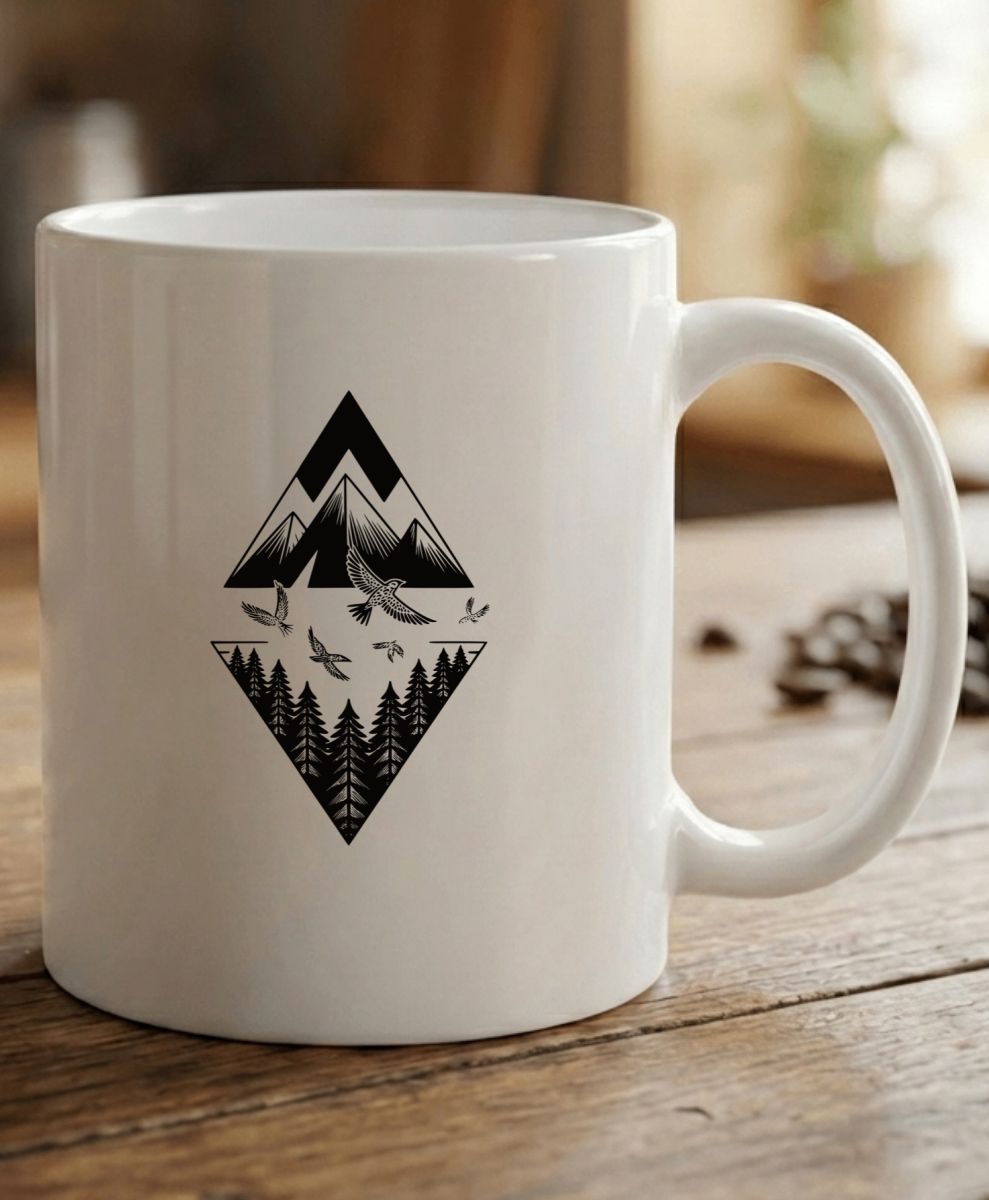 Design inspirovaný přírodou pro všechny dobrodruhy a milovníky hor. V geometrickém diamantu je zachycena silueta hor s lesy a jezerem, doplněná o stan. Ideální pro turisty, horolezce a všechny, kdo se rádi toulají v přírodě.