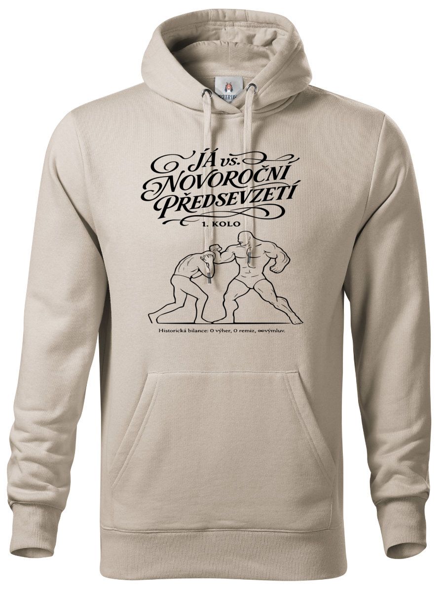 Já vs. předsevzetí – 1. kolo, černý potisk. Humorný boxerský motiv ilustrující věčný a předem prohraný souboj mezi námi a novoročními sliby. S historickou bilancí nula výher a nekonečna výmluv je toto tričko upřímným přiznáním každého věčného začátečníka.