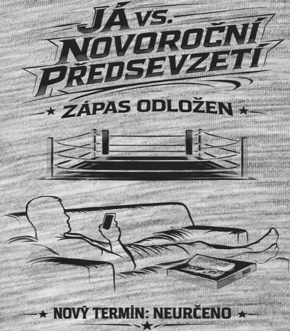 Já vs. Předsevzetí – Zápas odložen, černý potisk. Dokonalý motiv pro mistry v prokrastinaci, kteří svůj boj s novoročním předsevzetím vyměnili za pohodlí domova. Místo ringu gauč, místo rukavic pizza a mobil – protože tenhle zápas počká na neurčito.
