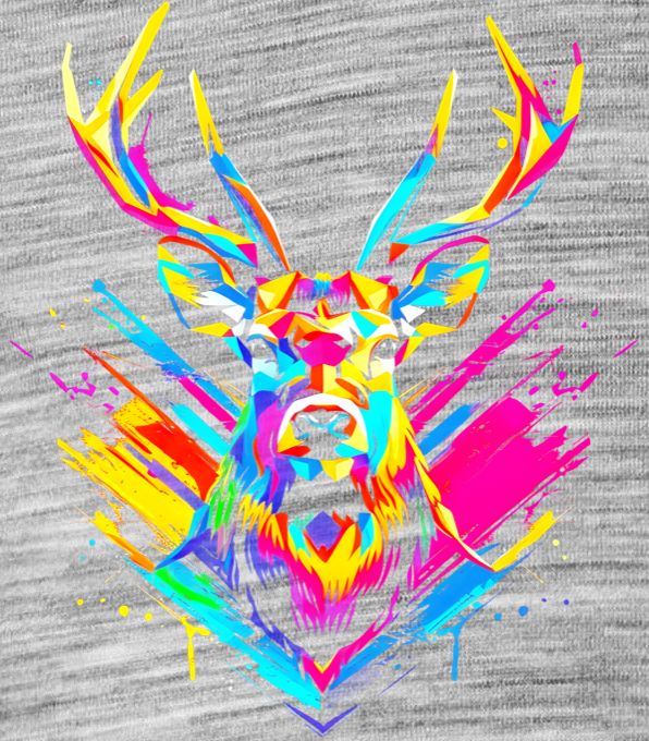 Jelení extravaganza. Majestátní jelen s parožím plným divokých barev a energie. Nádherná, nespoutaná grafika pro krále lesa, který se rozhodl být vidět.