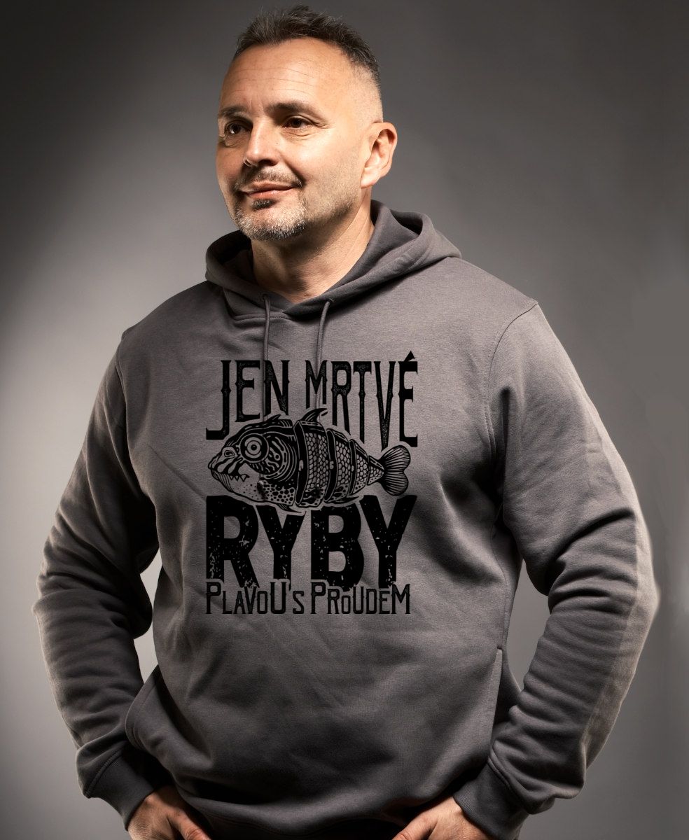 Jen mrtvé ryby plavou s proudem, černý potisk. Rybářské tričko, mikina, zástěra, kšiltovka. Ideální dárek pro rybáře, tátu, dědu, bráchu, kamaráda.