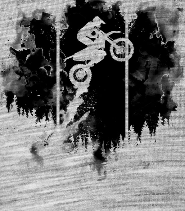 Jezdec terénem, černý tisk. Adrenalinová exploze v uměleckém stylu! Když jezdíš terénem, okolní svět se rozmaže a zůstane jen záplava emocí a rychlosti. Ponoř se do divoké akce.