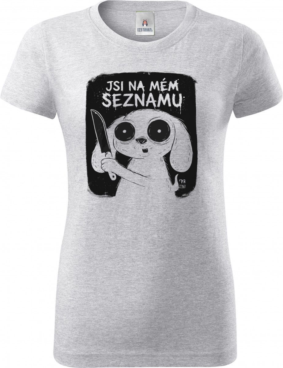 Jsi na mém seznamu, černý potisk. Roztomilost se smrtícím nádechem. Tento “creepy cute” motiv s králíčkem držícím nůž je perfektním vyjádřením černé lásky a sarkasmu pro všechny, kteří chtějí dát najevo, že mají své priority (a oběti) jasně srovnané.