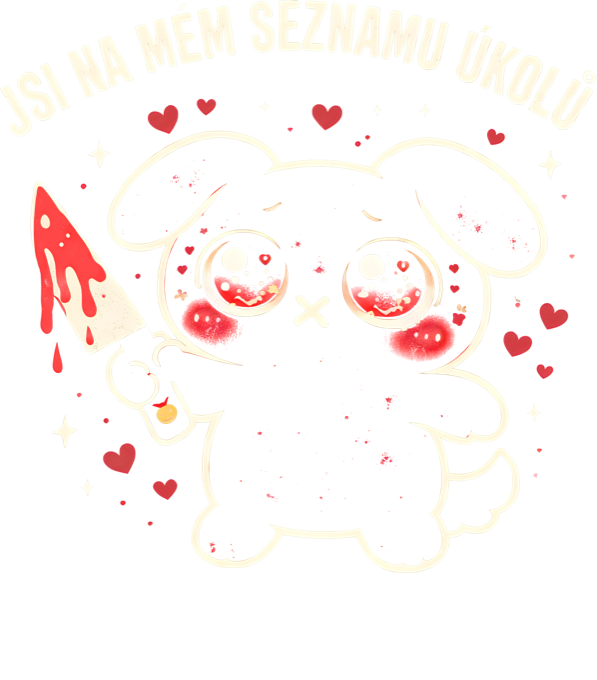 Jsi na mém seznamu úkolů. Roztomilost se smrtícím nádechem. Tento “creepy cute” motiv s králíčkem držícím nůž je perfektním vyjádřením černé lásky a sarkasmu pro všechny, kteří chtějí dát najevo, že mají své priority (a oběti) jasně srovnané.