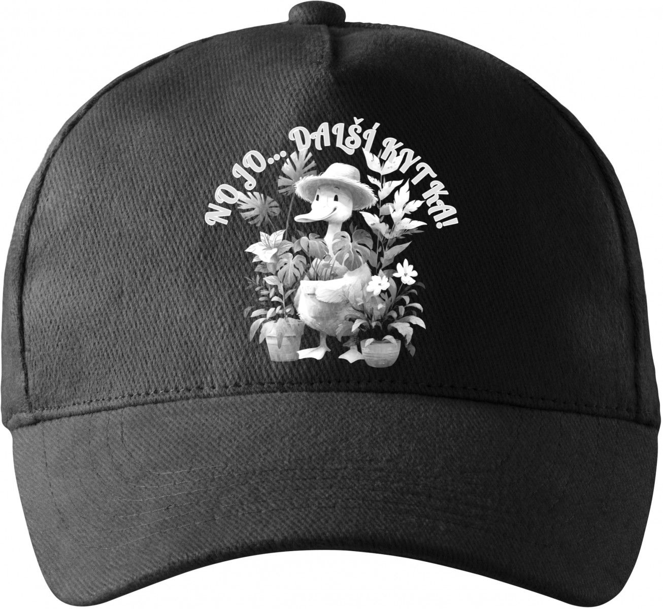 Kachní zahradník, bílý potisk. Kachna v klobouku, obklopená květy, s hláškou “NO JO… DALŠÍ KYTKA!” je ideální pro milovníky zvířecího humoru a ty, kteří berou život s nadhledem a s láskou ke kytkám.