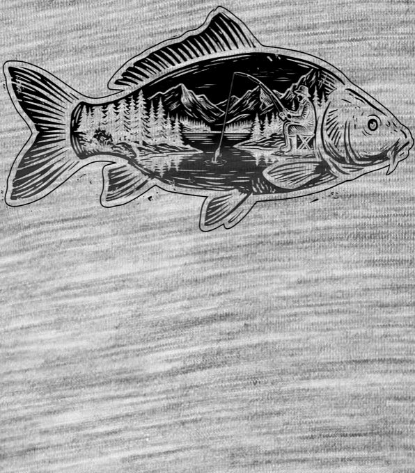 Kapr a krajina, černý potisk. Unikátní spojení rybářské vášně a klidu přírody. Silueta kapra v sobě ukrývá detailní kresbu horské krajiny s rybářem na břehu jezera. Jemné barvy a čistý design dělají z tohoto motivu perfektní kousek pro každého, kdo miluje ranní opar nad vodou a nekonečné čekání na ten správný záběr.