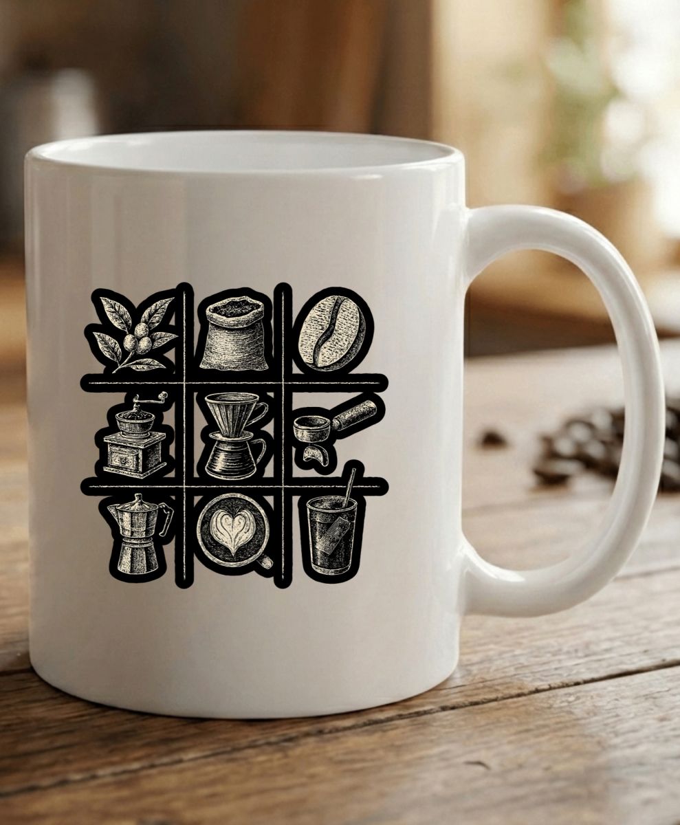Káva koláž. Devět okének plných kávy. Od zrnka, přes mlýnek, moka konvičku až po filtr a srdíčko z pěny. Ideální motiv pro baristy, milovníky ranního rituálu a všechny, pro které je káva víc než jen nápoj. Když nemáš energii, pomůže kofein i pohled na kávu.