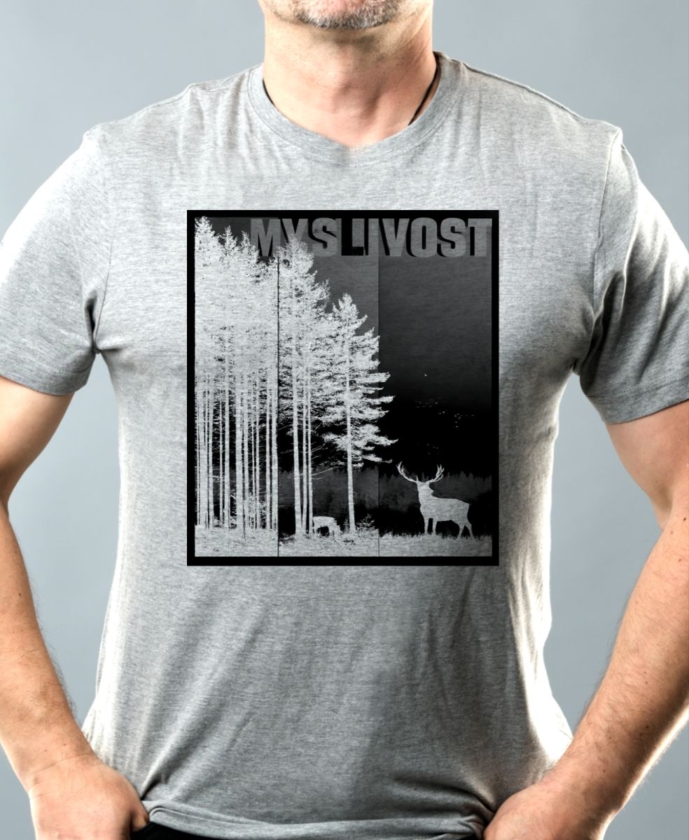 Klidná myslivost, černý potisk. Ranní mlha v lese a silueta jelena na obzoru – to je ten pravý klid, který pochopí jen zasvěcení. Motiv pro každého, kdo v lese nenachází jen stromy, ale především sám sebe.
