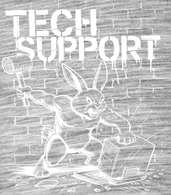 Králík technické podpory, bílý tisk. Když selže restart a “zkusit to vypnout a zapnout” už nepomáhá, povolává se náš IT hrdina s kladivem!