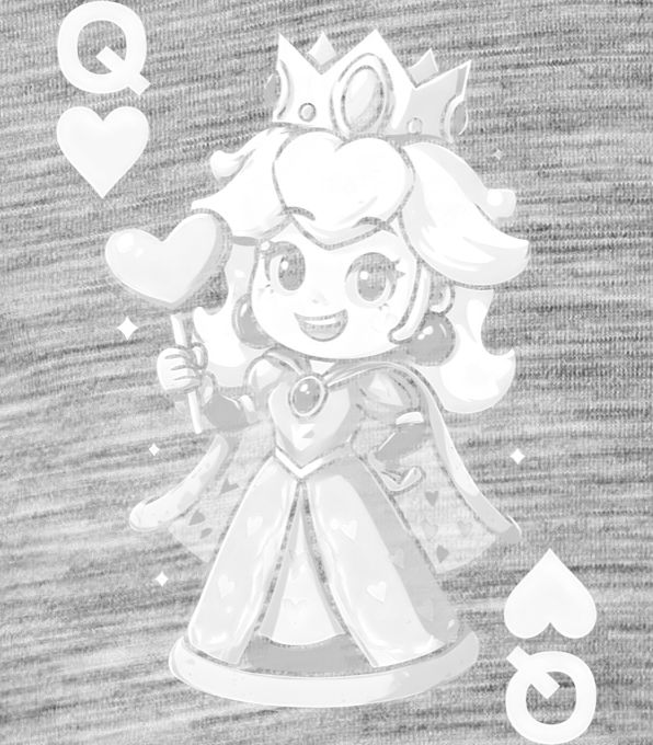 Královna srdcí, bílý potisk. Párty může začít! Královna Peach vládne srdcím i karetnímu balíčku! S kouzelnou hůlkou a šarmem, kterému neodolá žádný hráč, je připravena ukázat, kdo je tu opravdová královna.