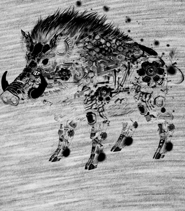 Kyber kanec, černý potisk. Pozor, jde Divočák 2.0! Tento kybernetický kanec s blikajícími světly a nespoutanou silou ukazuje, že divočina a technologie jdou ruku v ruce.
