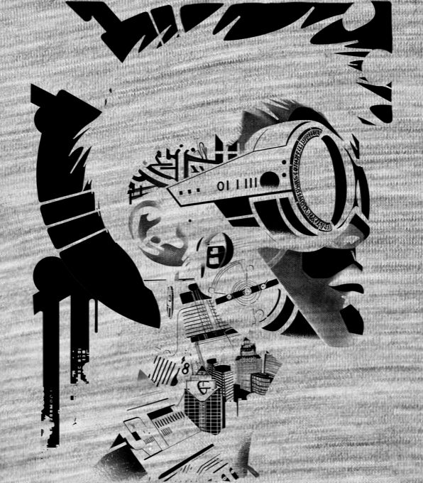 Kyber rebelka, černý tisk. Budoucnost volá! Tato rebelka je napůl člověk, napůl stroj a celá umělecké dílo. S touto kombinací železa a odhodlání se nenechá ovládat žádným systémem – jen těmi, co má uvnitř. Vstup do éry cyberpunku!