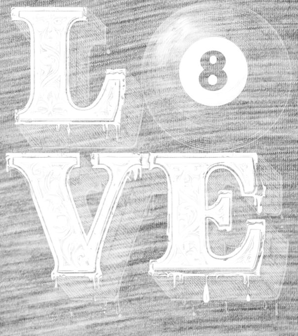 Láska ke kulečníku, V2, bílý potisk. Černá osmička v drsném „grunge“ stylu pro ty, co hrají srdcem. Design, který jasně ukazuje, že váš tlukot srdce se řídí rytmem narážejících koulí na zeleném suknu.
