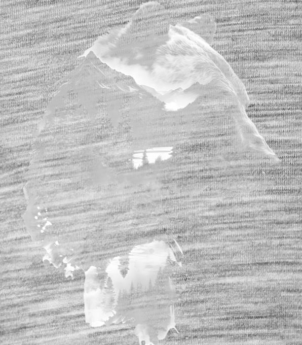 Medvěd v horách. V2, bílý potisk.Tento design s dvojexpozicí elegantně kombinuje portrét medvěda s dechberoucí horskou krajinou
