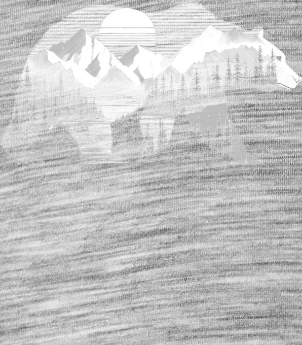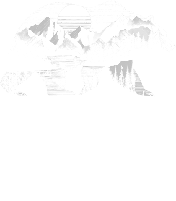 Medvěd s horskou krajinou, bílý potisk. Silueta medvěda v sobě skrývá horskou krajinu s jezerem a zářivým západem slunce. Tento motiv kombinuje majestátnost přírody s retro estetikou 80. let. Ideální pro milovníky hor a divočiny. Tričko, tílko, mikina, kšiltovka, zástěra.