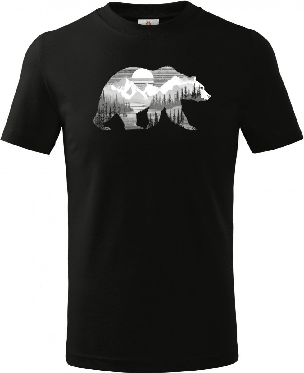 Medvěd s horskou krajinou,  bílý potisk. Silueta medvěda v sobě skrývá horskou krajinu s jezerem a zářivým západem slunce. Tento motiv kombinuje majestátnost přírody s retro estetikou 80. let. Ideální pro milovníky hor a divočiny. Tričko, tílko, mikina, kšiltovka, zástěra.