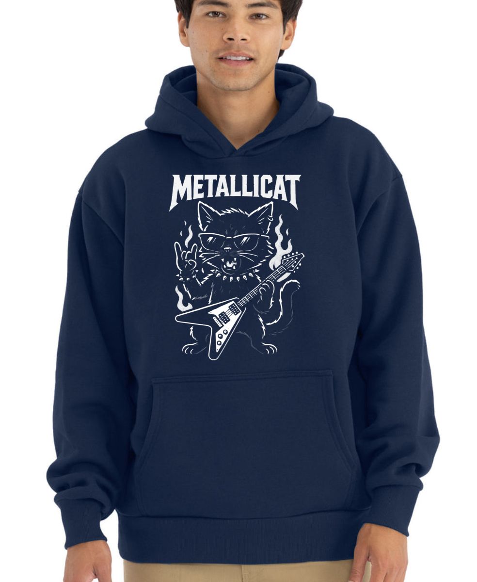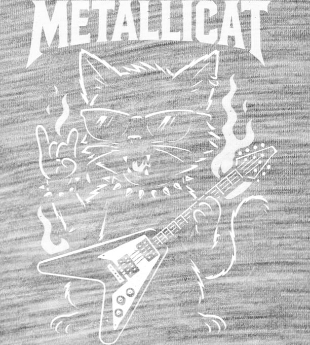 Metallicat – rocková kočka, bílý potisk. Drsný kytarista s devíti životy a obojkem plným cvočků! Naše kočka se narodila, aby hrála heavy metal a předváděla rockové paže.