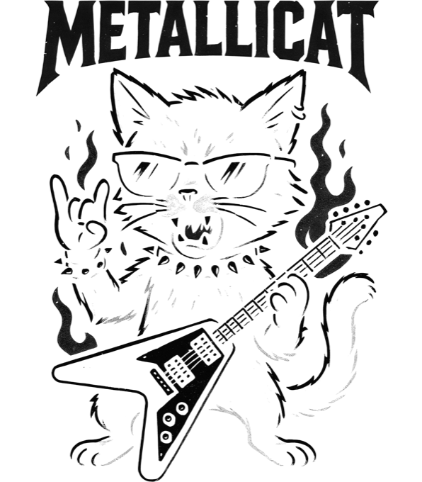 Metallicat – rocková kočka, černý potisk. Drsný kytarista s devíti životy a obojkem plným cvočků! Naše kočka se narodila, aby hrála heavy metal a předváděla rockové paže.
