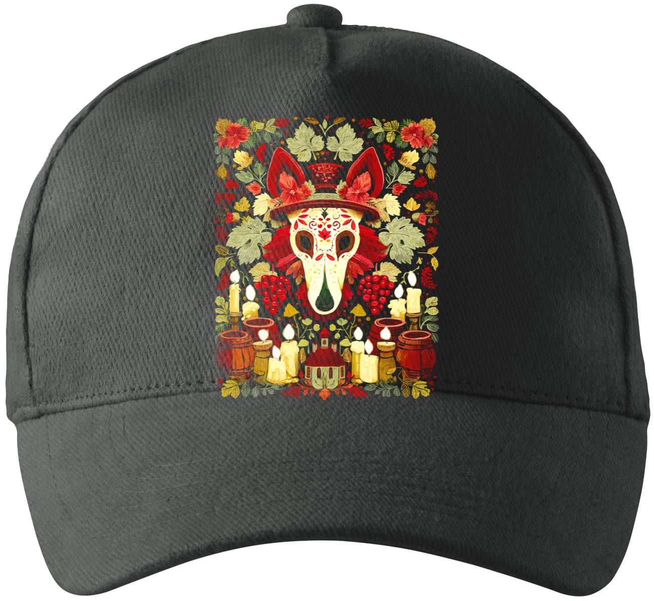 Mexická noc duší. Temný a přitom plný života! Lebka, obklopená bohatými květinovými vzory, vinnou révou a rituálními svíčkami. Vážnost tradice s hravým folklórním nádechem.