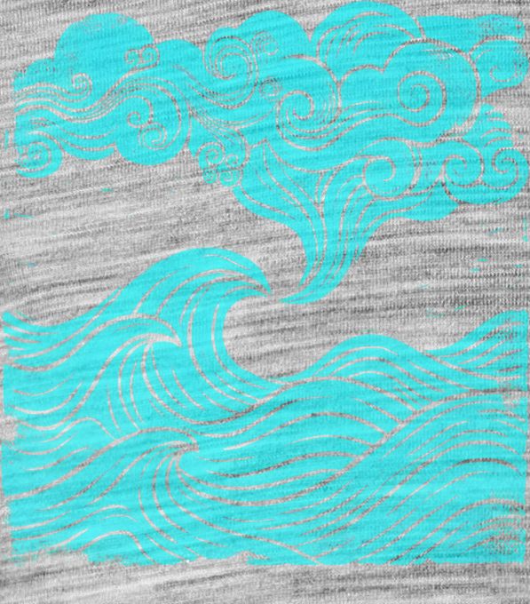 Mořské vlny. Dynamický design inspirovaný tradičním japonským uměním. Azurově modré vlny a stylizovaná mračna vytvářejí silný vizuální prvek, který připomíná nespoutanou sílu oceánu. Čistý, grafický styl s jemnou texturou skvěle vynikne na černém i barevném textilu. Ideální kousek pro milovníky moře, surfování nebo orientálního designu.