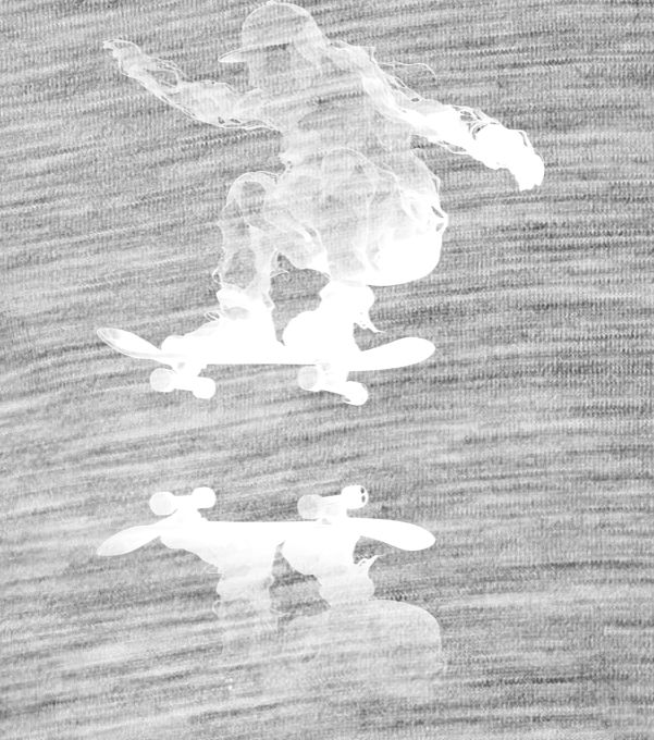 Nebeský skater , bílý potisk. Zachycený v ohnivém triku, tento skater pluje na vlně barevných oblaků.