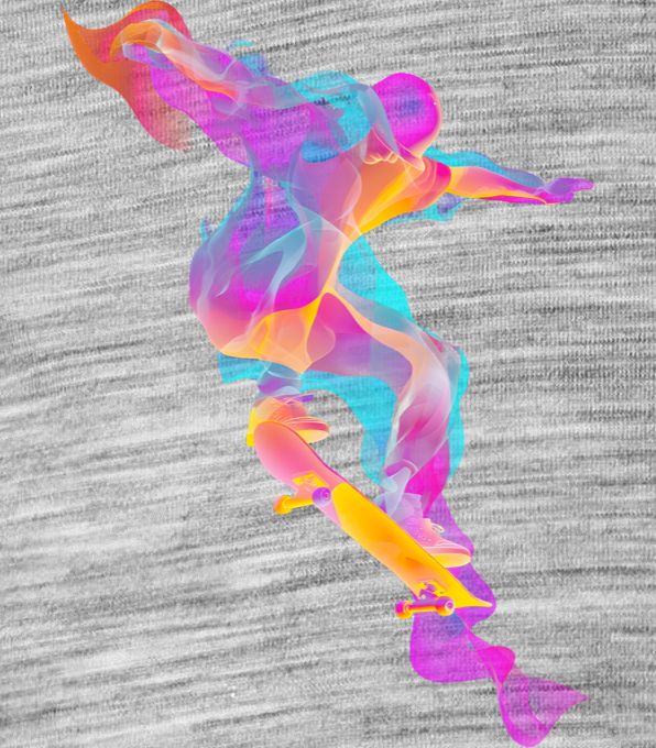Nebeský skater., V2. Zachycený v ohnivém triku, tento skater pluje na vlně barevných oblaků.