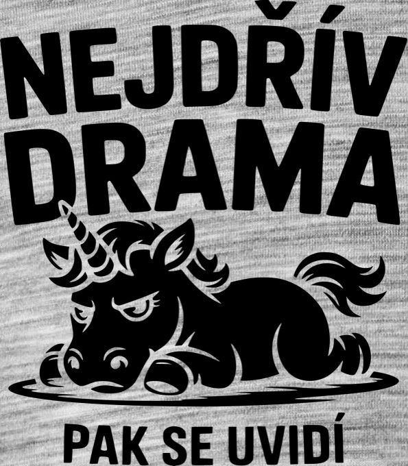 Nejdřív drama, černý potisk. Vtipný a upřímný motiv s naštvaným jednorožcem pro všechny, kteří si potrpí na trochu teatrálnosti, než se pustí do práce. Ideální vyjádření ranní nálady nebo ironický postoj k řešení problémů.