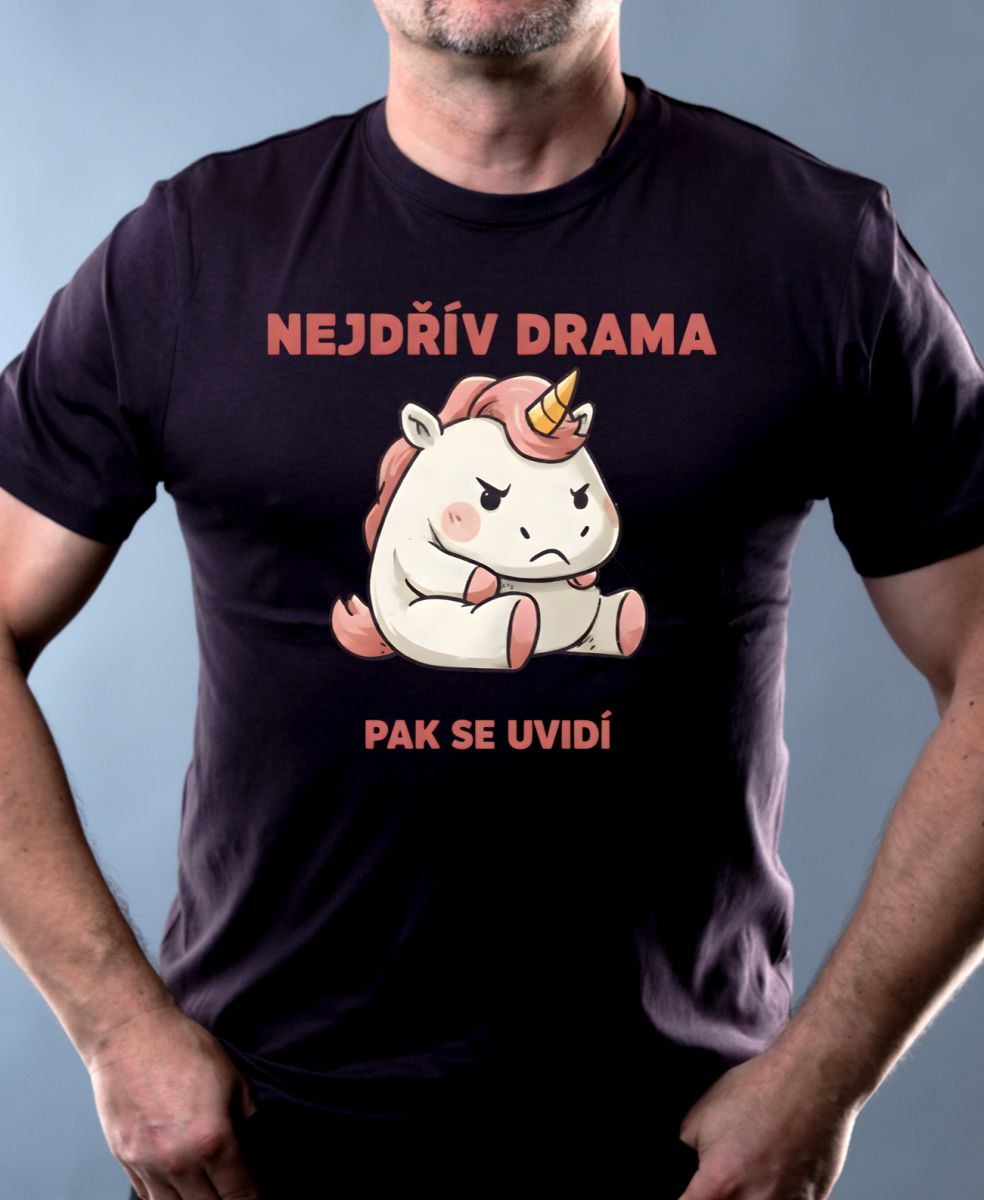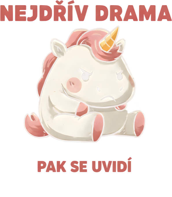Nejdřív drama, V2. Vtipný a upřímný motiv s naštvaným jednorožcem pro všechny, kteří si potrpí na trochu teatrálnosti, než se pustí do práce. Ideální vyjádření ranní nálady nebo ironický postoj k řešení problémů.