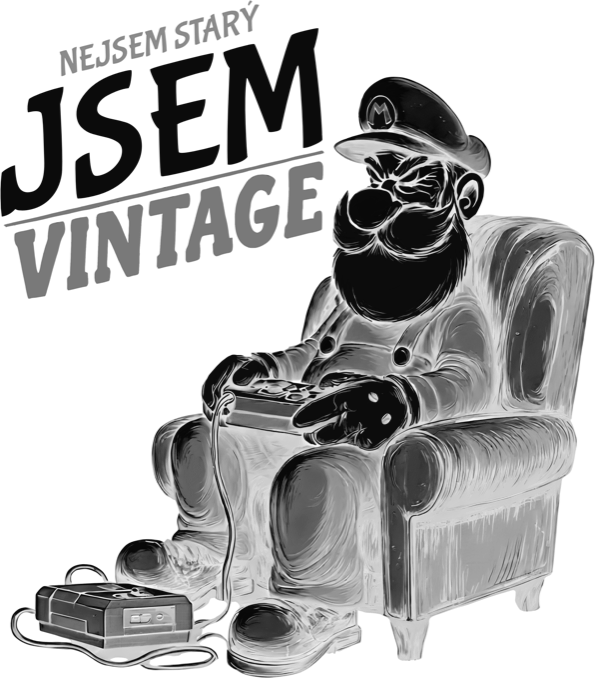 Nejsem starý, jsem vintage, černý tisk. Pro všechny herní veterány, kteří pamatují časy na 8-bitech a foukání do kazetek. Ukažte světu, že nepatříte do starého železa, ale do síně slávy jako ta nejlepší herní klasika.