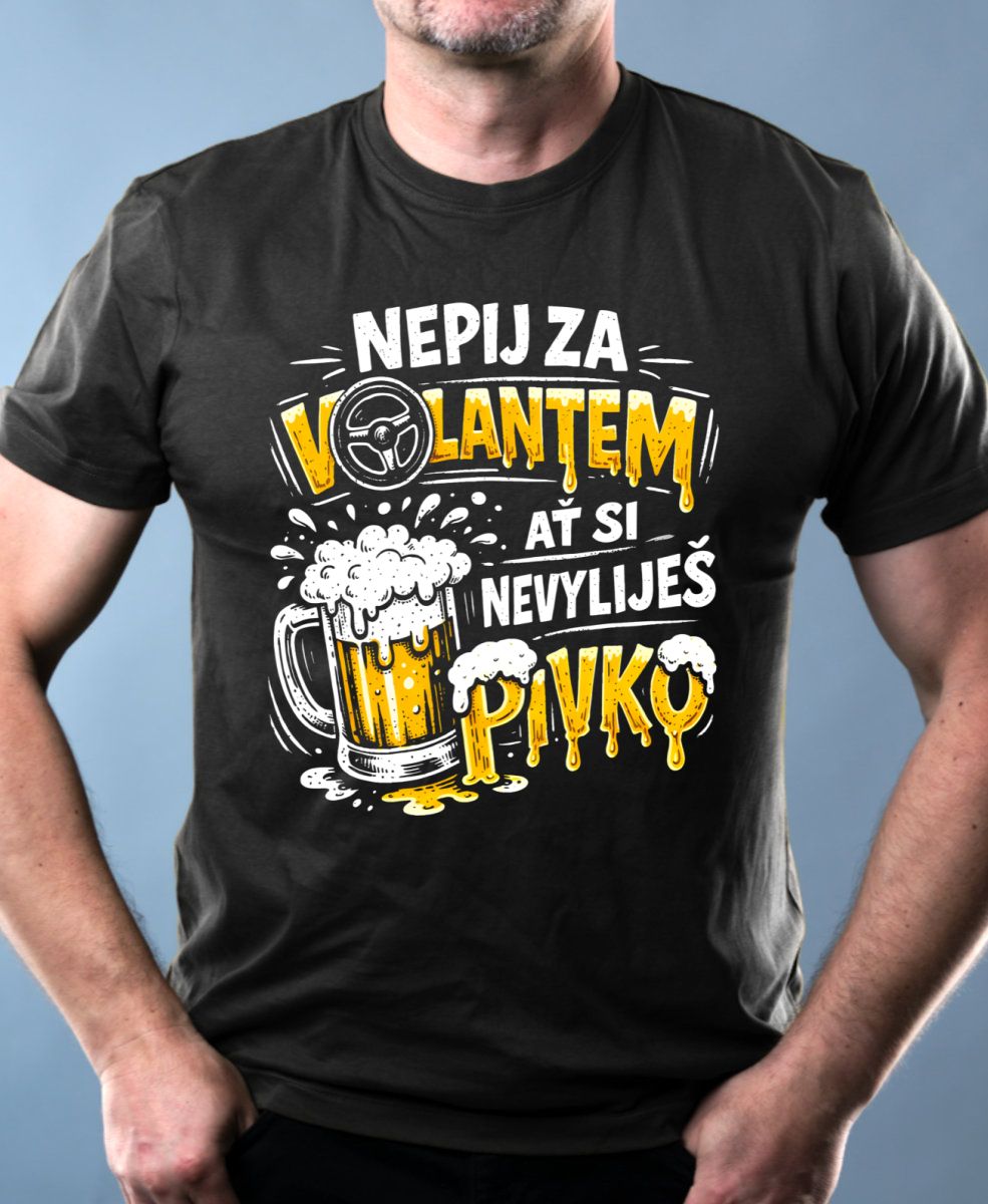 Nepij za volantem. Bezpečnostní pásy zapnout, pivo zajistit! Vtipný motoristicko-pivní motiv, který uvádí na pravou míru, proč se vlastně nemá pít za volantem – protože by byla škoda každé kapky, která skončí na potahu místo v žaludku